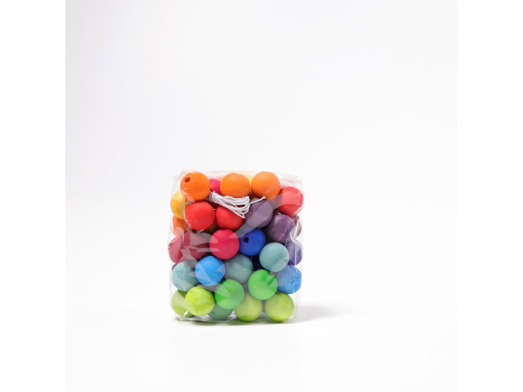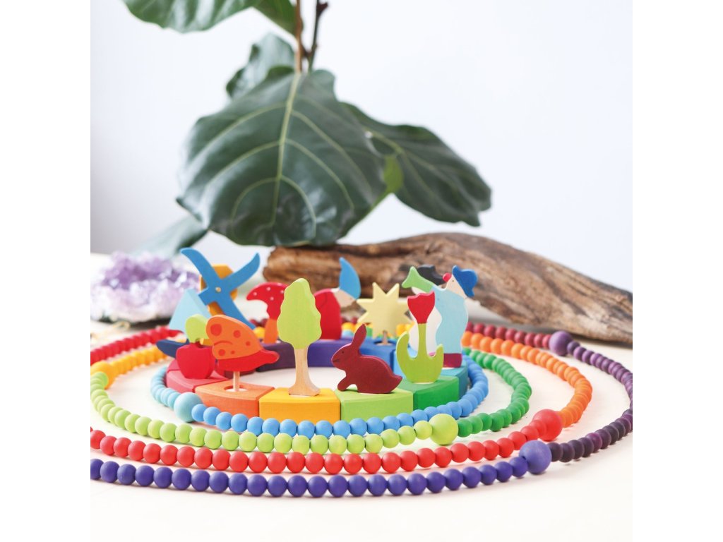 Dřevěné korálky jsou jedním z nejzákladnějších herních materiálů pro děti. Při navlékání se stimuluje koordinace oko-ruka a trénuje se jemná motorika. Tyto barevné dřevěné korálky jsou tříděny ve 12 barvách duhy.