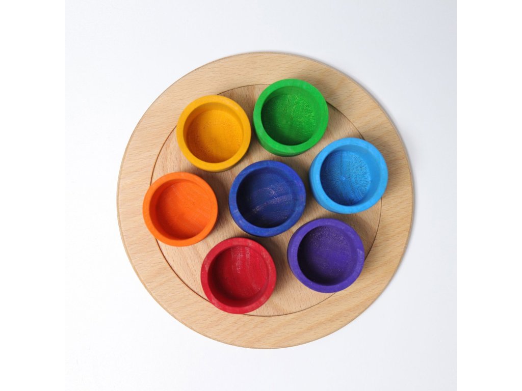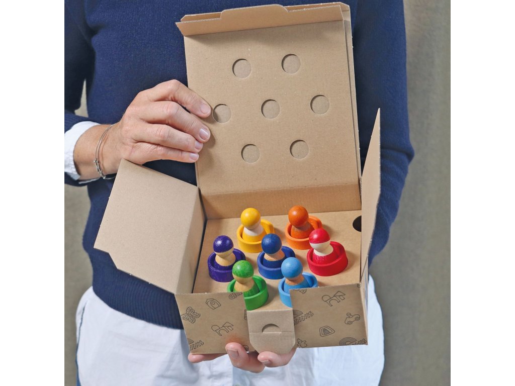Sada 7 přátel v miskách učí nejmenší děti správně přiřazovat barvičky a hledat barevné kombinace. 7 přátel může představovat 7 dní v týdnu a při hře i 7 trpaslíků. Figurky jsou poměrně velké a dětem se dobře uchopují. Děti je mohou zabydlet ve svých stavbách z dřevěných kostek, později je mohou oblékat i pomalovat, jak se jim zalíbí. Přátelé ze dřeva jsou vyrobeni ze dřeva javoru, jsou ručně malováni a mají výšku 6 cm, sílu 3 cm. Celý rámeček má délku 19 cm. Vhodné pro děti od 1 roku.