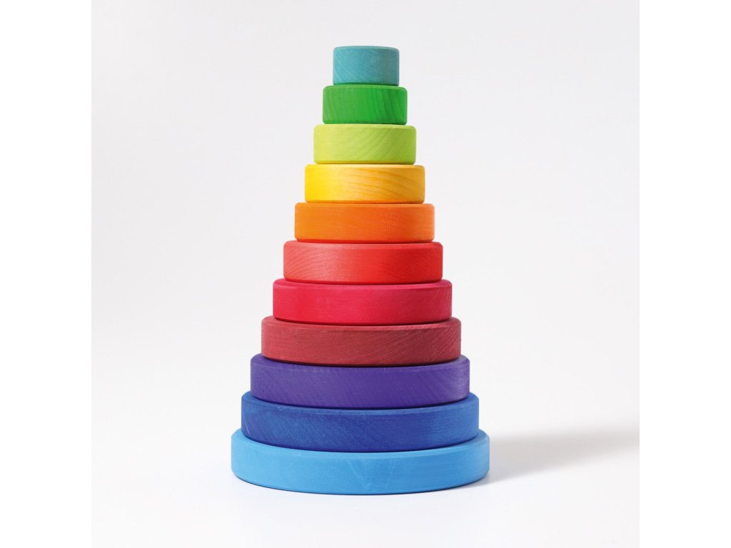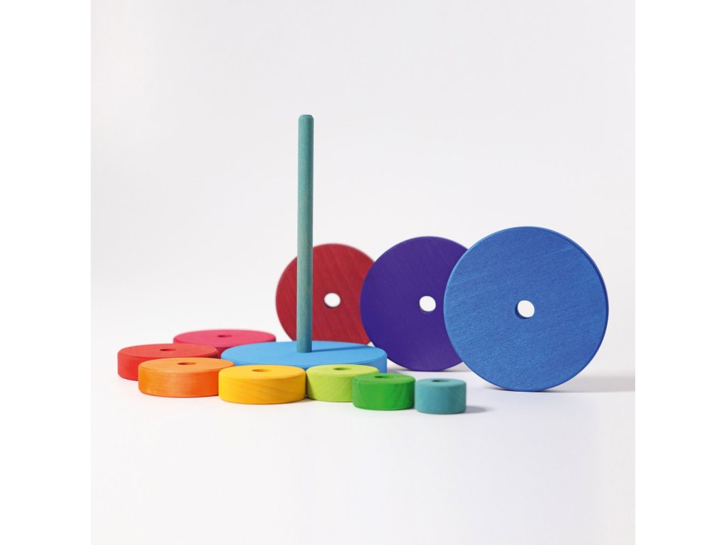 Velká dřevěná skládací pyramida v krásných duhových barvách má 10 různě velkých nasouvacích koleček. Tato se nasunují na dřevěnou tyčku s podstavcem. Děti mohou svým skládáním formovat nejrůznější tvary a barevné kombinace. Která kolečka jsou malá a která velká a jak se jmenují jednotlivé barvičky? Kolečka mají sílu 2 cm a výtečně se kutálejí. Rozkutálet na dlouhou klidnou jízdu to největší kolečko není vůbec snadný úkol. Dílky skládací pyramidy jsou velké a až děti vyrostou z období nasunovacích pyramid, využijí dřevěné dílky pro jiné stavby z dřevěných kostek. Kolečka tak poslouží jako podlahy, terasy, střechy, do dírek je možné nasunovat různé ozdoby, vlaječky, využijí je jako odsunovací dveře do garáží. Vhodné pro děti od 1 roku.