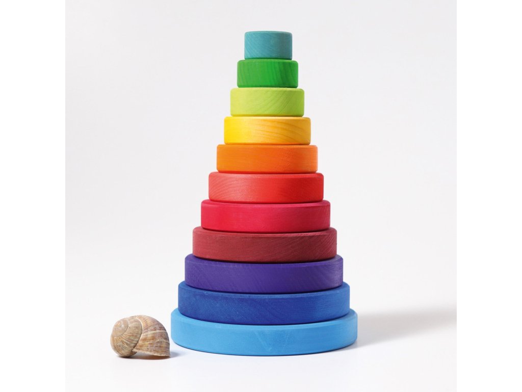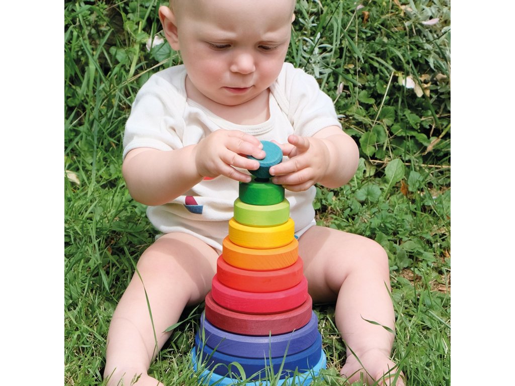 Hledáte hračku pro děti okolo jednoho roku? Nasouvací věže a různé pyramidy jsou tou správnou a vhodnou hračkou pro tento věk. Malé děti objevují nové, skládají, třídí, nasouvají, přeskládávají, řadí jednotlivé dílky – to je jejich nejoblíbenější činnost. A když hračka nabízí dítěti široké možnosti využití, bude je doprovázet dlouhou dobu. Hračky Grimm's jsou úžasně barevné, děti se brzy naučí barvičky pojmenovat. Dále se učí rozlišovat věci malé a velké, světlé a tmavé. Jednotlivé dílky těchto hraček jsou dostatečně silné, aby je děti mohly využívat i jako stavební kostky. Nastrkovací čili nasouvací věže rozvíjí jemnou motoriku dětí a senzomotoriku. Dalšími vhodnými hračkami v tomto věku jsou nasouvací krabičky, ale i skládačky duha a 4 živly a tahací zvířátka. Hračky Grimm's jsou vyrobeny z evropských dřevin, jsou ošetřeny ekologickými barvami a olejem a voskem, takže příjemně voní po přírodě. Dřevěné hračky Grimm's navíc vynikají svoji neobyčejně krásnou, ladivou a zářivou barevností.