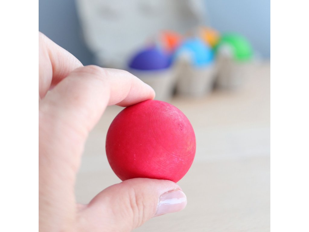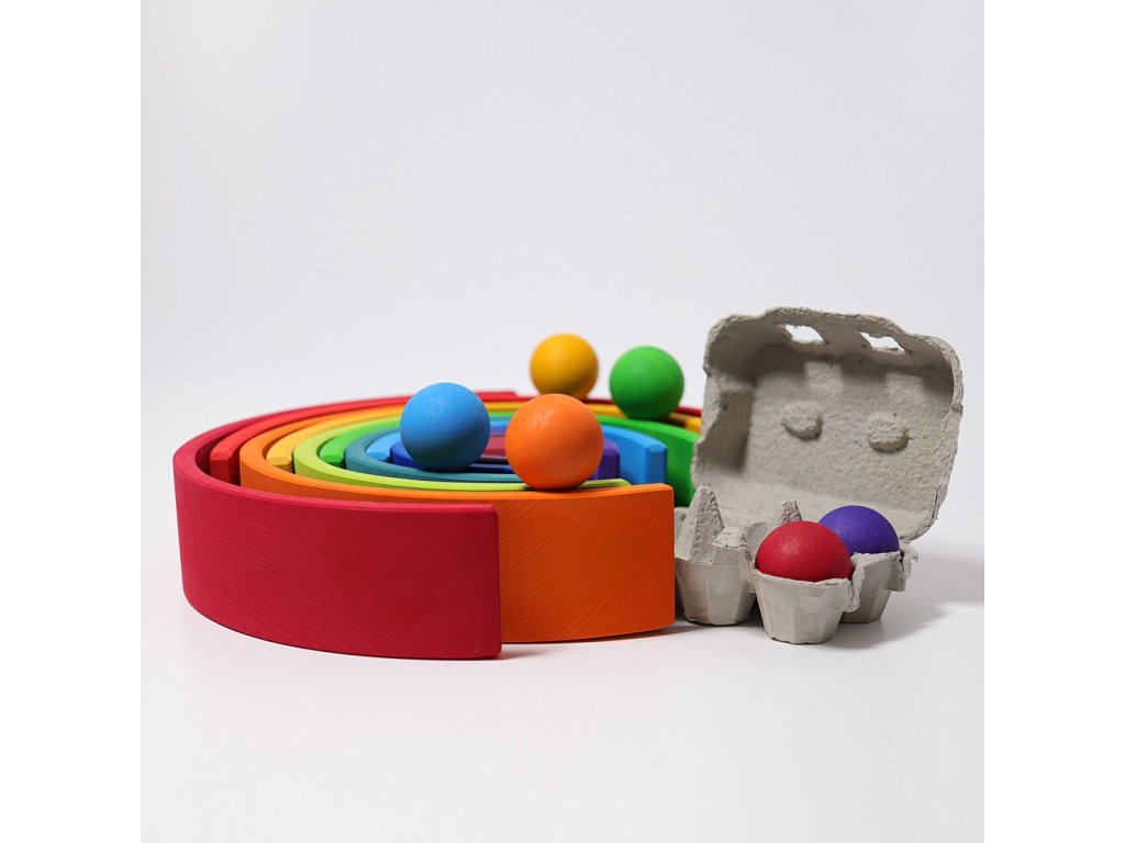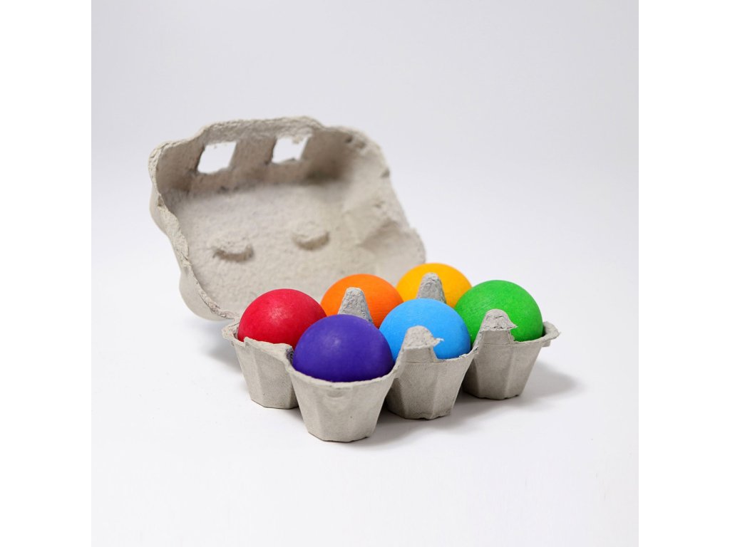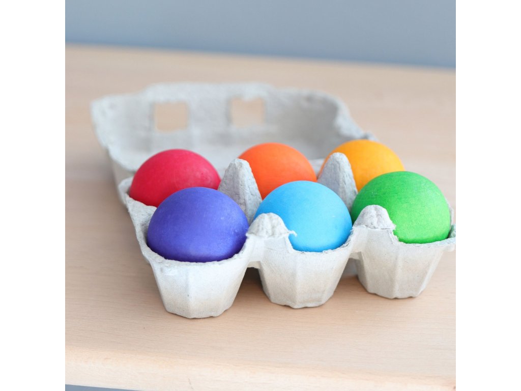 Velké dřevěné kuličky v malém kartonu na vajíčka. Kuličky mají velikost 45 mm a děti je mohou již od útlého věku zapojit do svých her. Naučí se kuličky rozkutálet a chytat, nasměrovat do branek i přiřazovat k ostatním stejně barevným dílkům. S kuličkami je možné úžasně bourat kuželky z kostek, vdechnout jim duši a hrát s nimi příběhy, ujíždět mezi domečky ve městě, převracet je v krabičce nebo je houpat v duhové houpačce. Kdo kuličku nejdéle na houpačce udrží? Tyto kuličky jsou také vhodné pro kuličkovou dráhu, kterou si můžete postavit z velké duhy. Vhodné pro děti od 2 let.