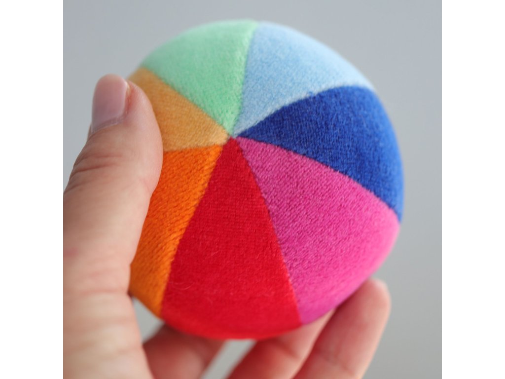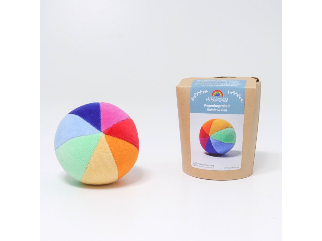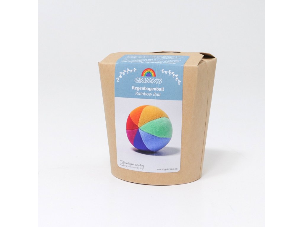 Textilní míček v duhových barvách. Míček je vhodný již pro nejmenší děti a je vynikající hračkou pro procvičování motoriky a navíc stimuluje zrakové smysly dětí. Míček je ručně vyráběn z nicky látky a plněn je výplňovou vatou. Výplň míčku je pevná a uvnitř je skryto chrastítko, které při hře vydává jemné zvuky. Textilní míček lze prát ručně při teplotě 30° C za použití jemného mýdla. Hračky Grimm's jsou vyráběny z nezávadných materiálů a jsou koncipovány tak, aby podporovaly fantazii a kreativitu dětí. Vhodné pro děti od narození.