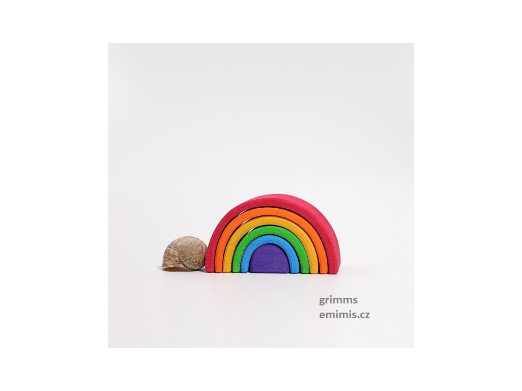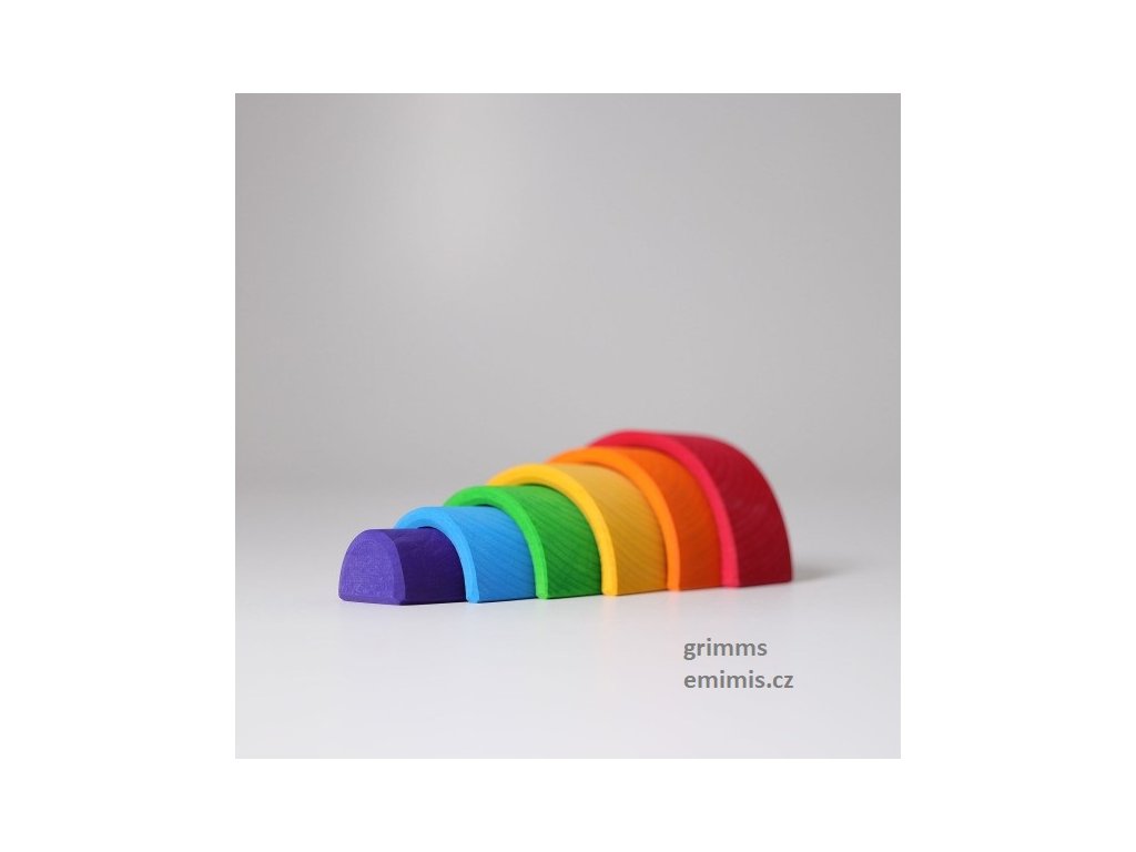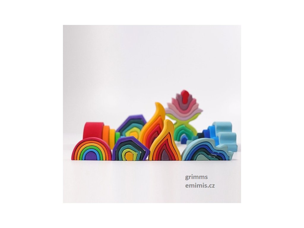 Nejmenší duha symbolizuje vzduch ze série čtyři živly. Duha obsahuje 6 různě barevných půlkruhů. Především duha (živel vzduch), ale i ostatní tři stavebnice elementů země, voda a oheň jsou hračkou nabízející širokou řadu možností hraní. Jednotlivé dílky slouží dětem jako mosty, tunely, ploty, domečky, obrácené jako kolébky či houpačky. Menší dílky stavebnice jsou vhodné i jako dekorace. Až uvidíte děti, jak si hrají, když je jim ponechán volný prostor pro kreativitu, budete sami překvapeni, jak různorodé tyto hračky jsou. Hledáte hračku pro děti od jednoho roku a výše? Ty nejmenší děti kolem jednoho roku rády třídí, řadí a skládají jednodušší věci. S krásnými hračkami Grimm´s se navíc učí rozeznávat barvičky. Okolo tří let začínají děti stavět s fantazií. Vznikají tak města a celé krajiny, které využívají pro rolové hry s autíčky a panenkami. Dřevěné stavebnice rozvíjí motoriku dětí a senzomotoriku. Hračky Grimm´s jsou vyrobeny z evropských dřevin, jsou ošetřeny ekologickými barvami a olejem a voskem, takže příjemně voní. Dřevěné hračky Grimm´s navíc vynikají svoji neobyčejně krásnou, ladivou a zářivou barevností, přitahují pozornost a vyzývají tak děti k novým hrám.