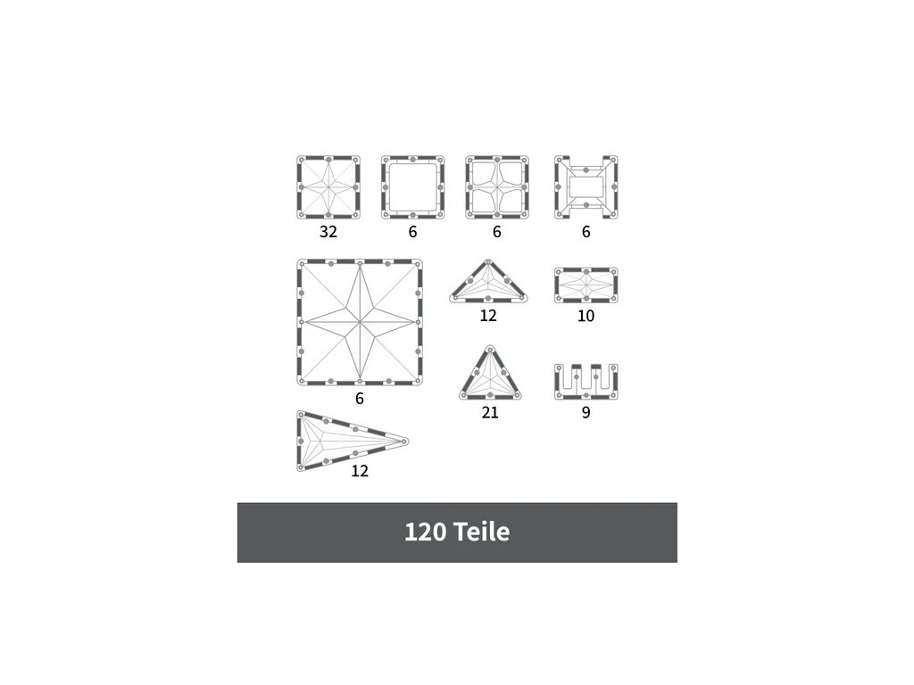 32 x čtverec, 21 x malý trojúhelník, 12 x dlouhý trojúhelník, 12 x pravoúhlý trojúhelník,
