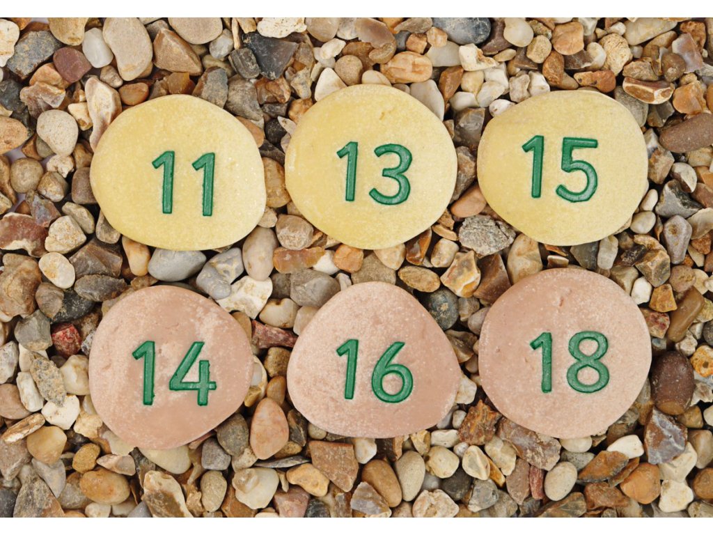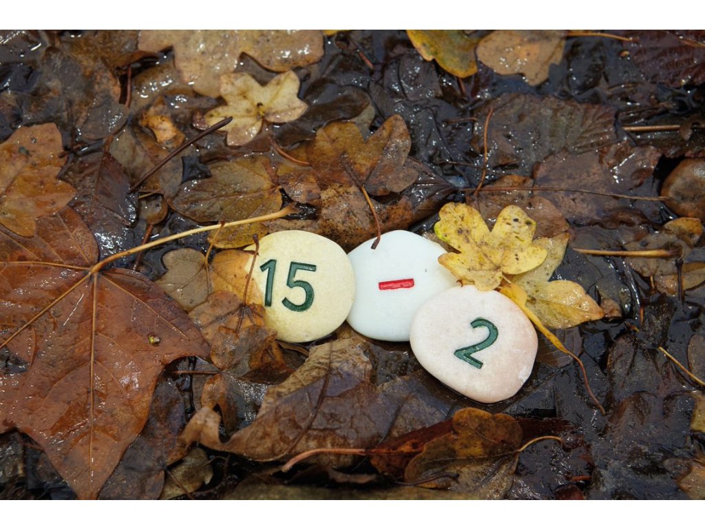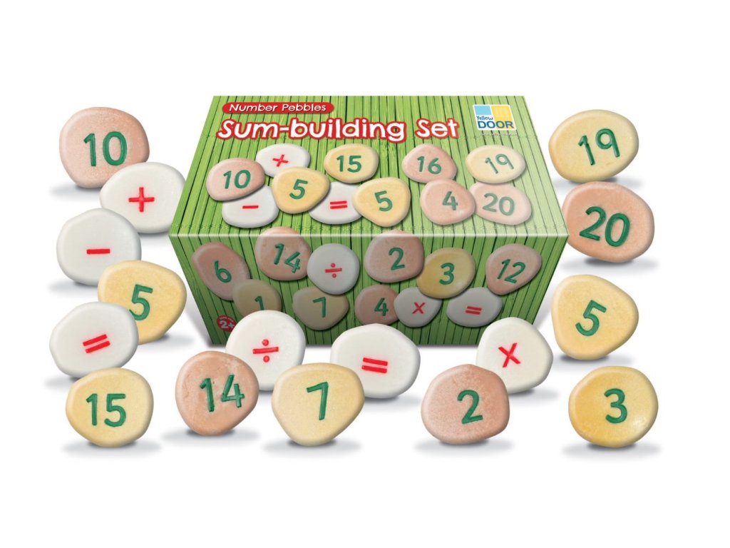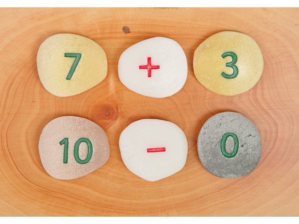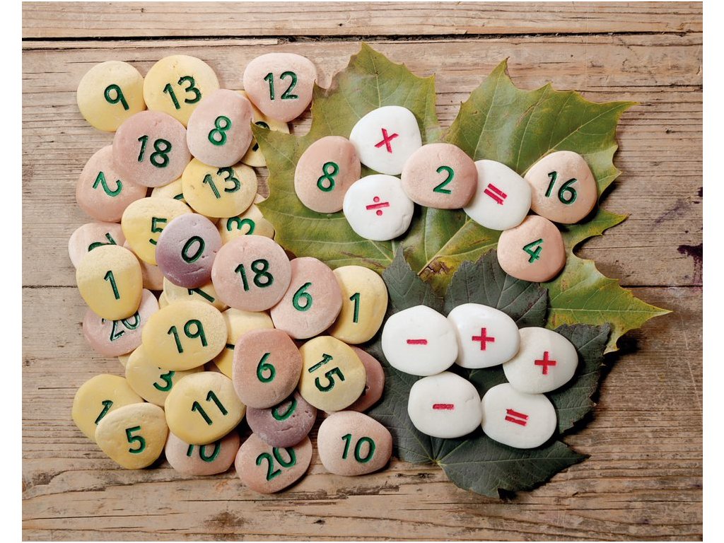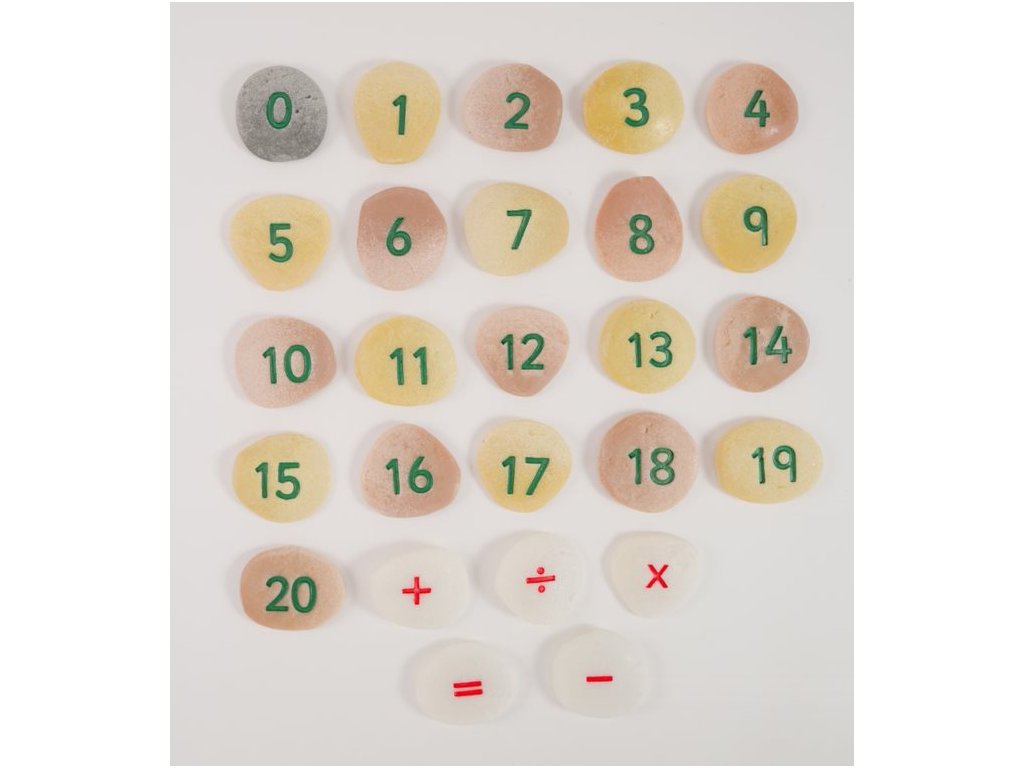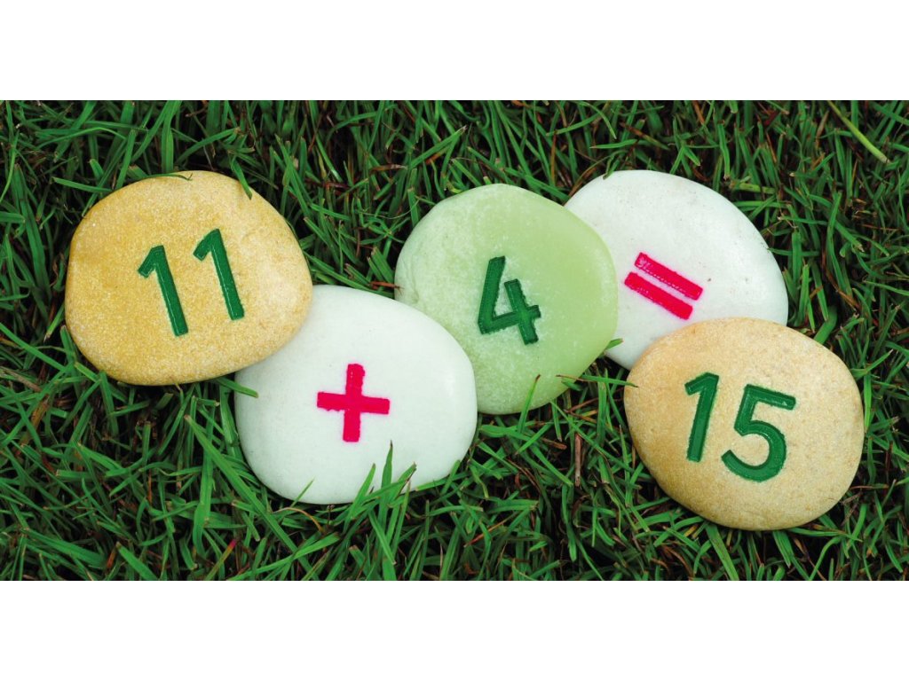 Každá sada obsahuje dvě čísla 0-20, +, -, = a po jednom x a ÷ (50 oblázků).