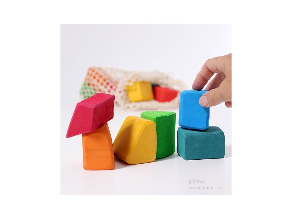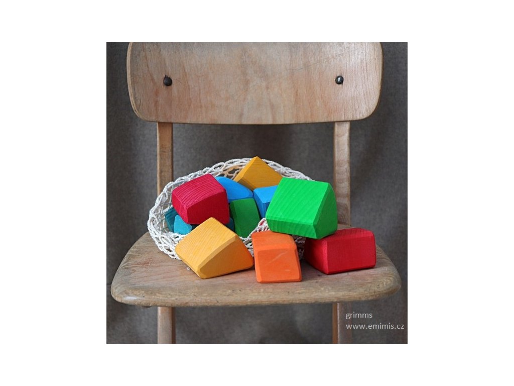 Stavební kostky jsou elementární a velice důležitou hračkou pro děti. Malé děti okolo 1 roku věku staví věžičky a opětovně je bourají, plní kostkami různé nádoby jen proto, aby je znovu vysypaly. Okolo 3 roku hraje fantazie při hře dětí velkou roli. Kostky slouží jako auto, kladivo, žehlička, různá zvířátka. Děti staví domy, hrady a celé krajiny. Tak jsou tyto stavebnice neodmyslitelným průvodcem dětstvím až do přibližně 10 let. Již malé děti zažívají s kostkami Grimm's brzy první úspěchy proto, protože kostky nejsou lakovány a nekloužou. Kostky jsou jedna po druhé ručně broušeny, takže nemají ostré hrany. Stavební kostky Grimm's jsou vyrobeny z nezávadných materiálů, evropských dřevin a díky ošetření olejem a voskem krásně voní. Děti upoutají jejich krásné tvary, úžasné barvy a hlavně to, že se jim dobře drží. Zdravotní nezávadnost a neopakovatelný design jsou hlavní charakteristikou výrobků Grimm's.